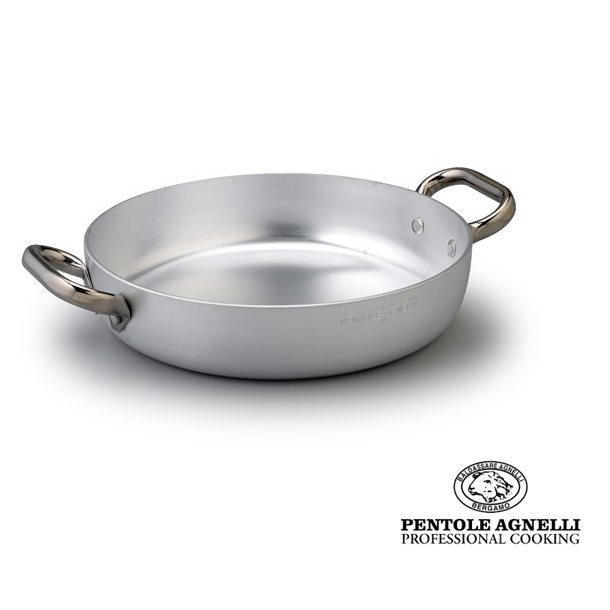 It comes with two handles. 8 mm bottom for induction hobs. Made of 3mm aluminum ideal for thermal conductivity. Extremely versatile and easy to handle. Recommended for mixing are a wooden or polyethylene ladle. Do not wash in the dishwasher. Never overheat before use. Dimensions: Ø 28 x h 5.5 cm. Straight walls. Handle size: 5.5 cm. For induction cooking.